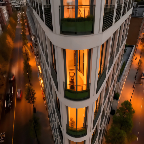 The exterior is defined by a distinctive curved corner façade, carefully designed to blend seamlessly with neighbouring buildings while establishing a strong architectural identity. Premium stone cladding and refined detailing contribute to a timeless, elegant appearance. The design emphasises proportion, rhythm, and material quality, ensuring the building enhances the character of Chapel Street and the wider local context.
